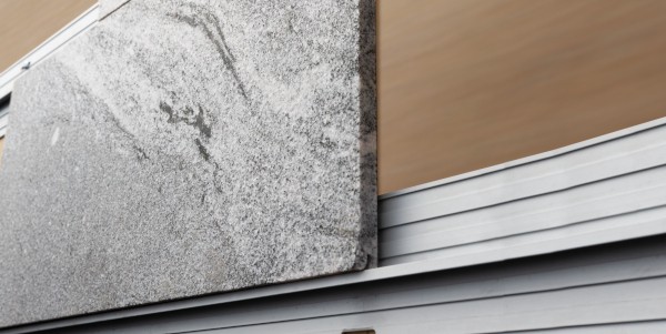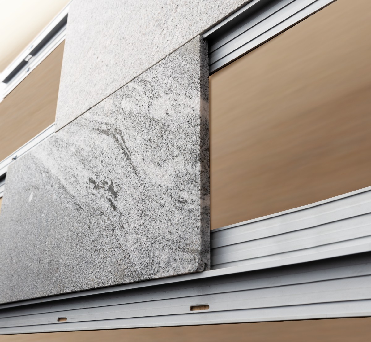 ■上下に溝加工した本物の天然石を金属レールに差し込みスライドし、施工する乾式工法です。