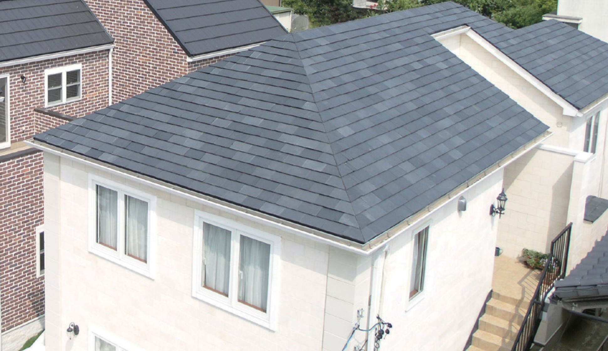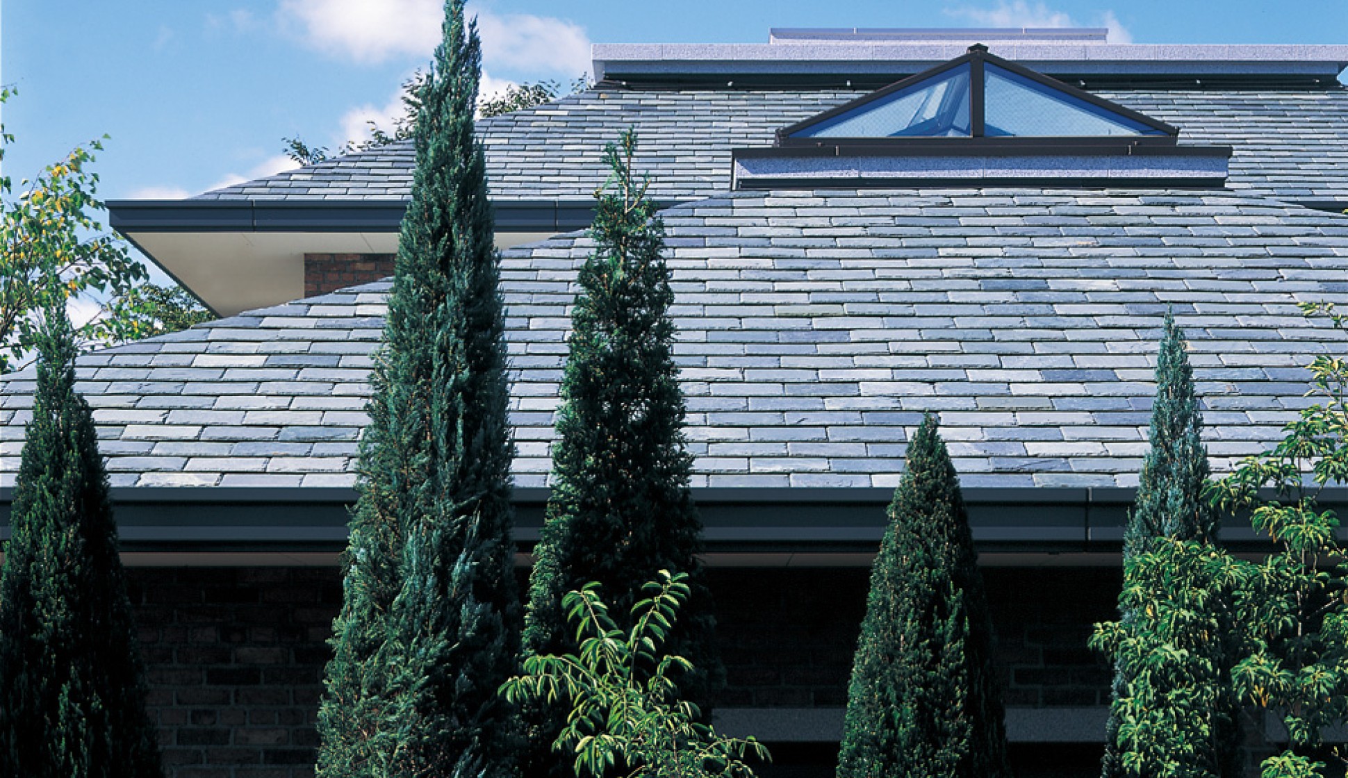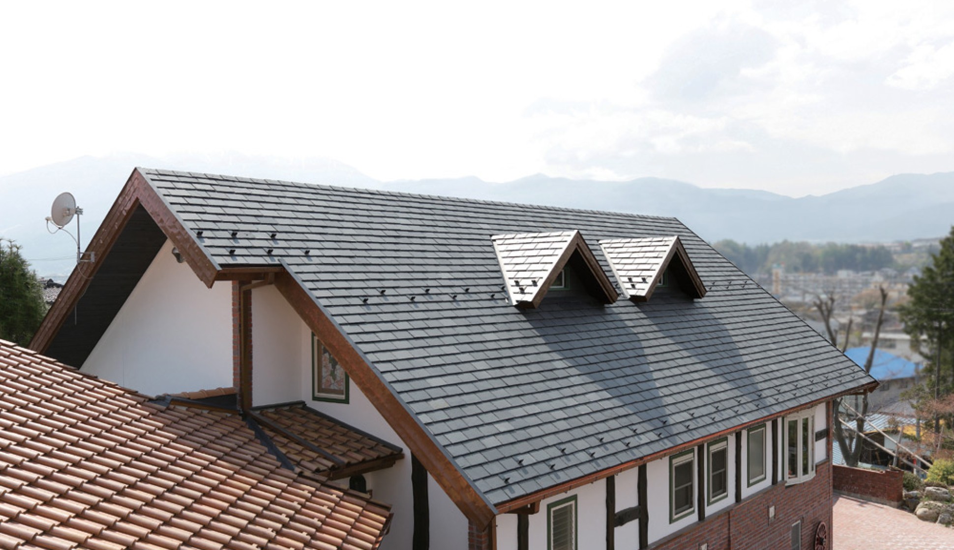 マルシカでは、天然スレート一枚一枚に金属製水切りを取り付け、天然スレートに平板瓦の施工性を持たせました。