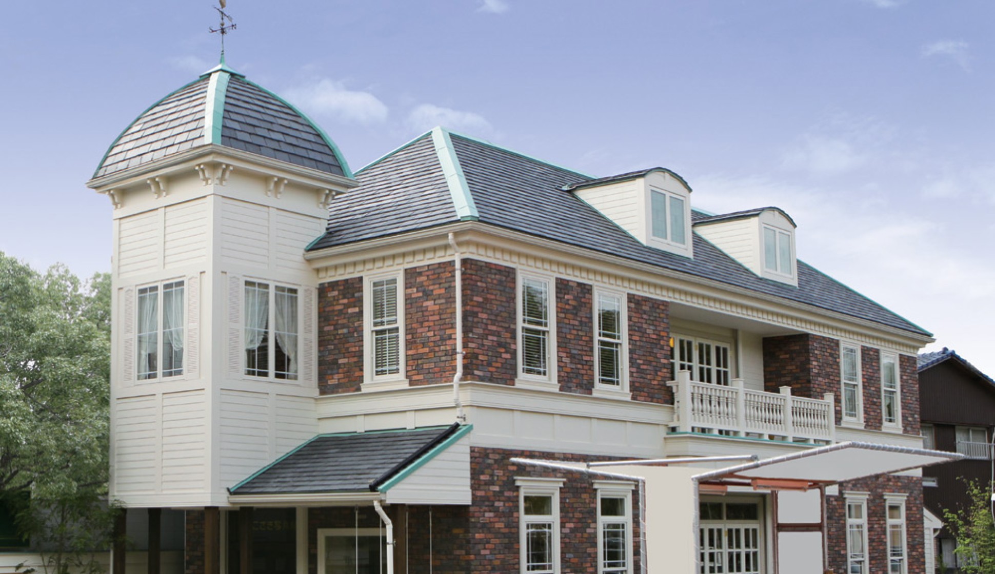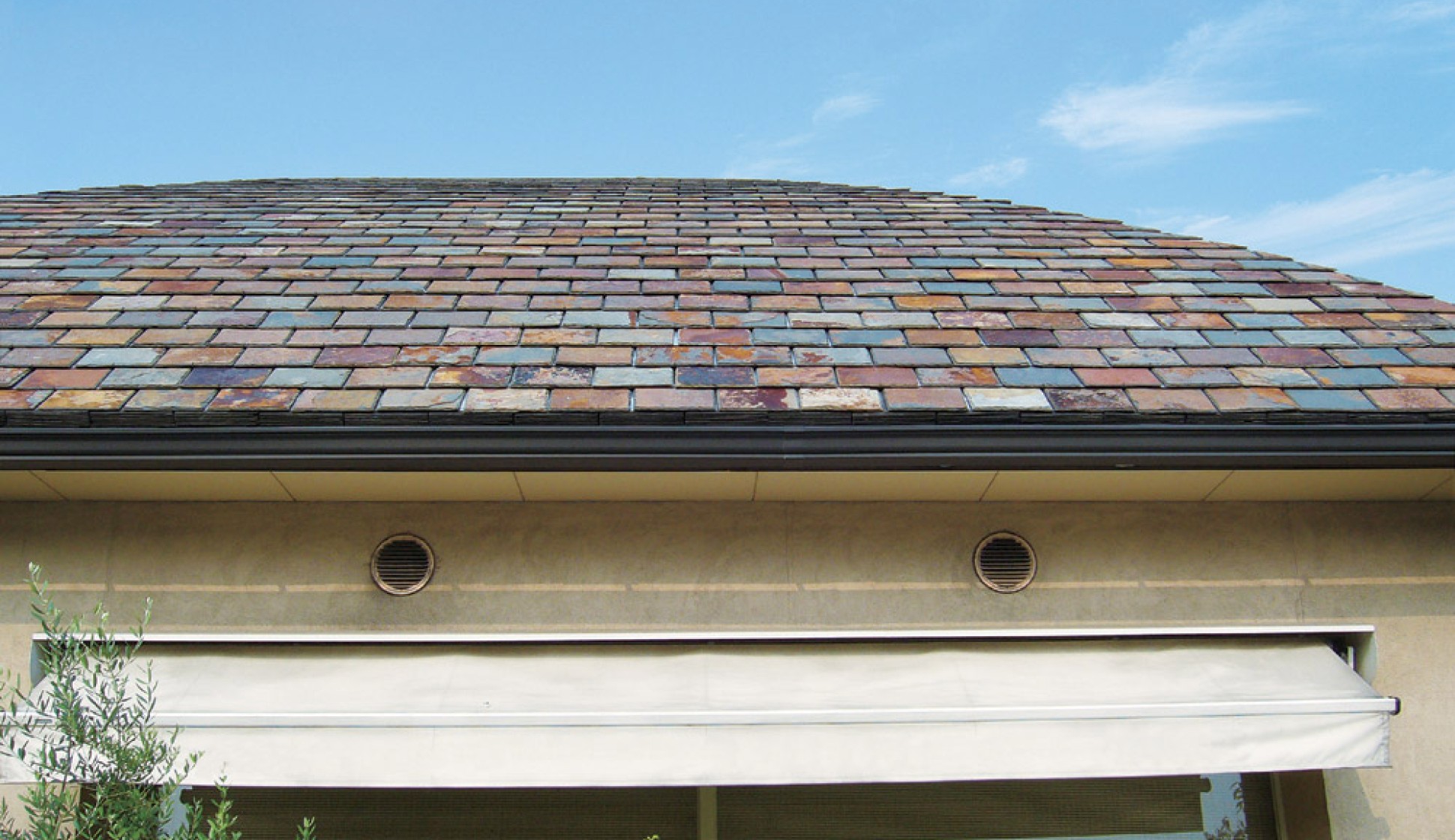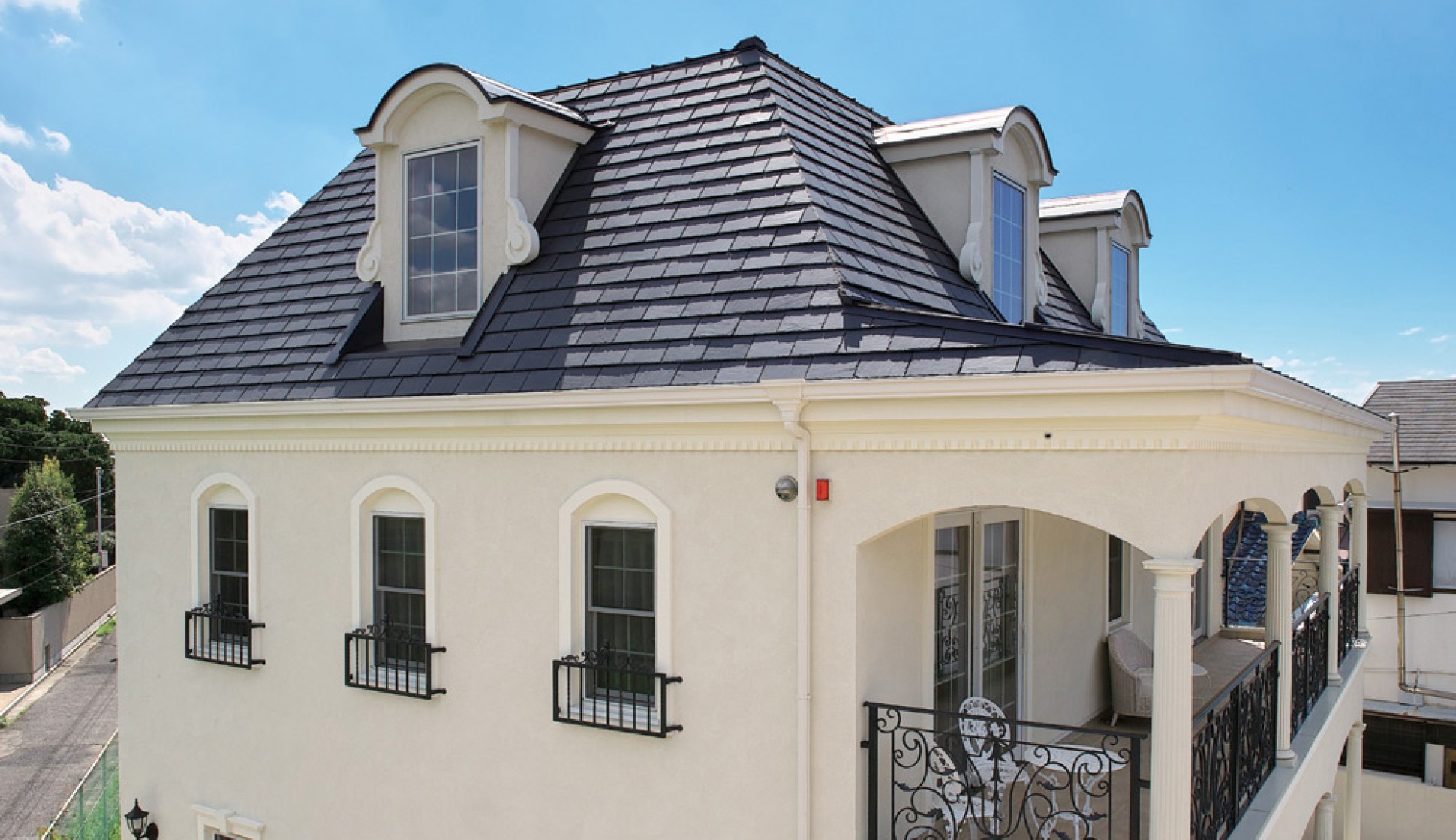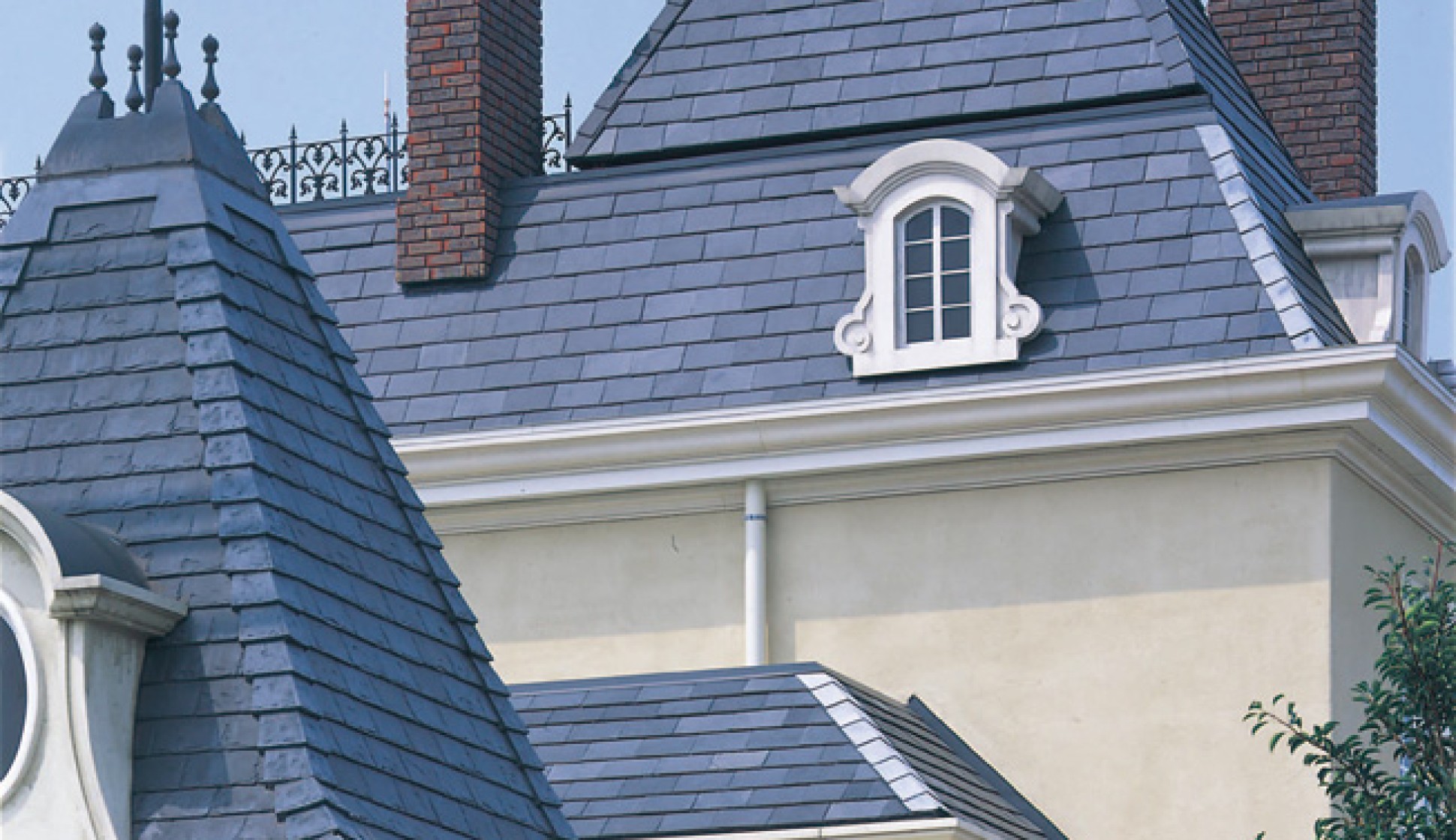マルシカでは、天然スレート一枚一枚に金属製水切りを取り付け、天然スレートに平板瓦の施工性を持たせました。