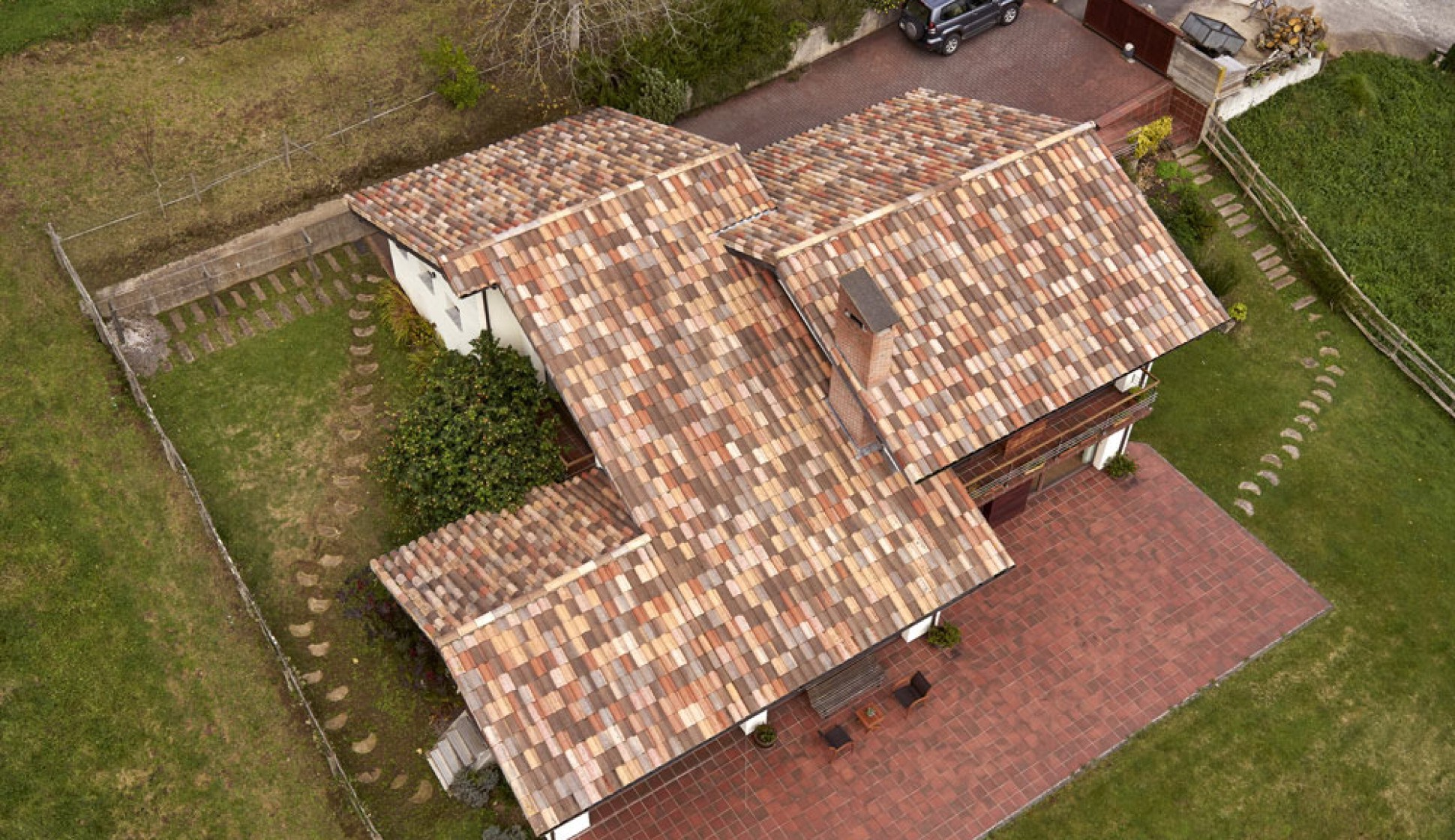 タイルでは幅広く表現されている自然素材を、研究開発の様々なプロセスを経て、インクジェットシステムを用い瓦に印刷し、自然素材の豊かで繊細な表現を演出したインクジェットルーフです。